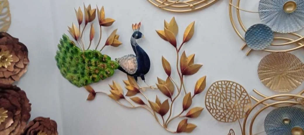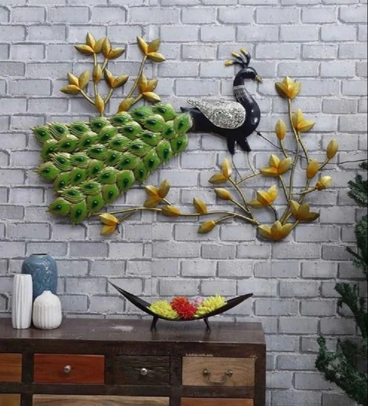 Enhance your living space with this stunning Iron Peacock & Floral Wall Art, beautifully handcrafted to bring elegance and charm to your home. Featuring a majestic peacock with a vibrant green tail surrounded by golden metal leaves and intricate circular patterns, this artwork adds a luxurious and artistic touch to any wall.