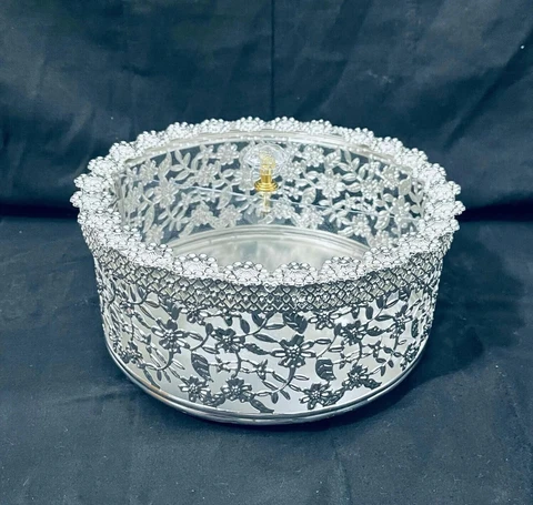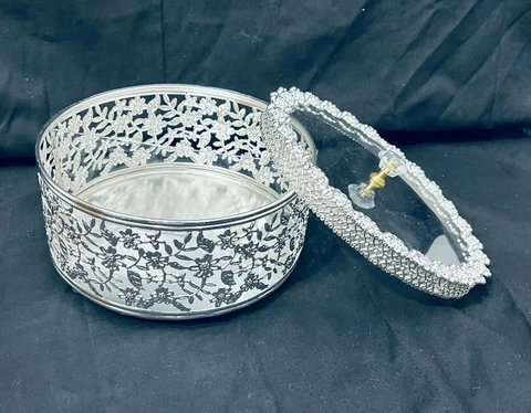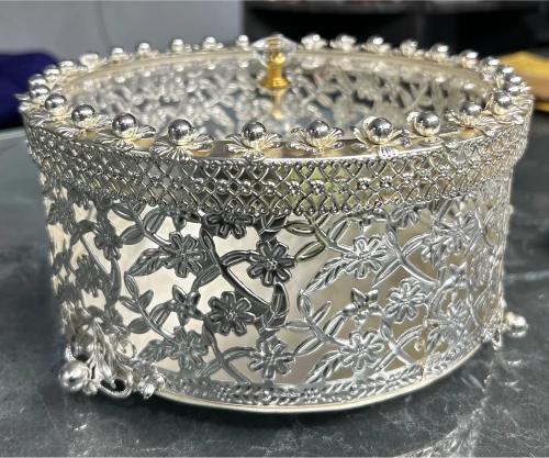 Crafted with exceptional attention to detail, this handmade silver-toned container is more than just storage – it’s a statement piece for sophisticated home decor. The intricate filigree design allows glimpses of light to play through its delicate cutwork, creating mesmerizing shadows and depth. A subtle golden accent at the top adds a touch of warmth and elegance.