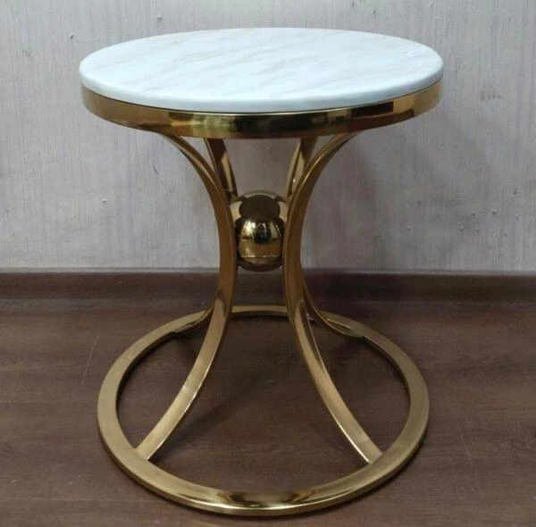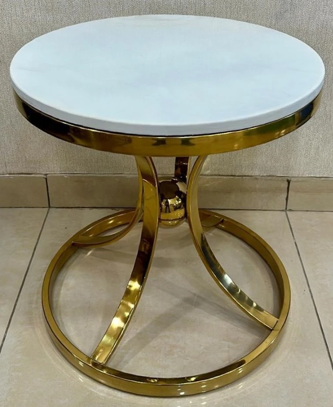 The base is crafted from highly polished gold-tone stainless steel. Its design features gracefully curved legs that meet at a central point, forming a beautiful, stable hourglass or pedestal silhouette. This structure rests on a circular base ring, enhancing its stability and overall dazzling effect.