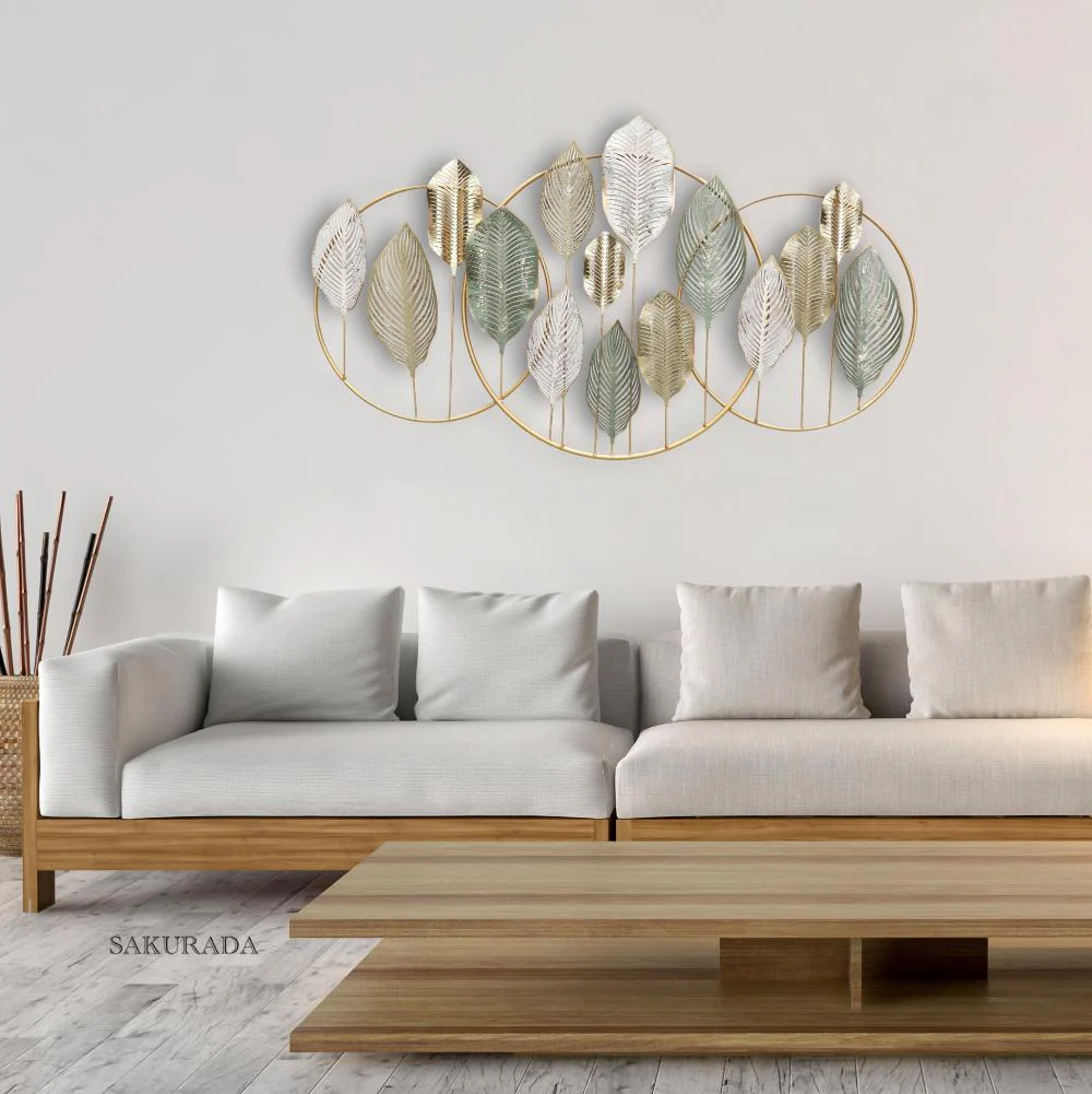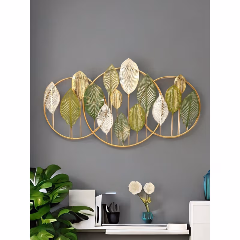 This handmade Transform your living space with our exquisite Golden Leaf Symphony Metal Wall Art, a stunning statement piece that blends contemporary design with natural elegance. Meticulously crafted with intricate leaf-shaped elements in a harmonious palette of soft greens, yellows, and whites, this wall sculpture is mounted on elegant golden circular frames that create a mesmerizing visual rhythm.