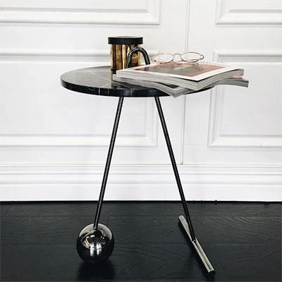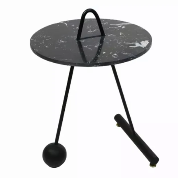 The base is a bold, asymmetrical tripod design crafted from sleek, dark gunmetal or black-finished steel. The legs feature playful details, including a polished sphere on one leg and an angled crossbar on the floor, providing excellent stability while maximizing visual interest. Perfect as a portable side table, a chic alternative to a nightstand, or a unique accent in a reading nook.