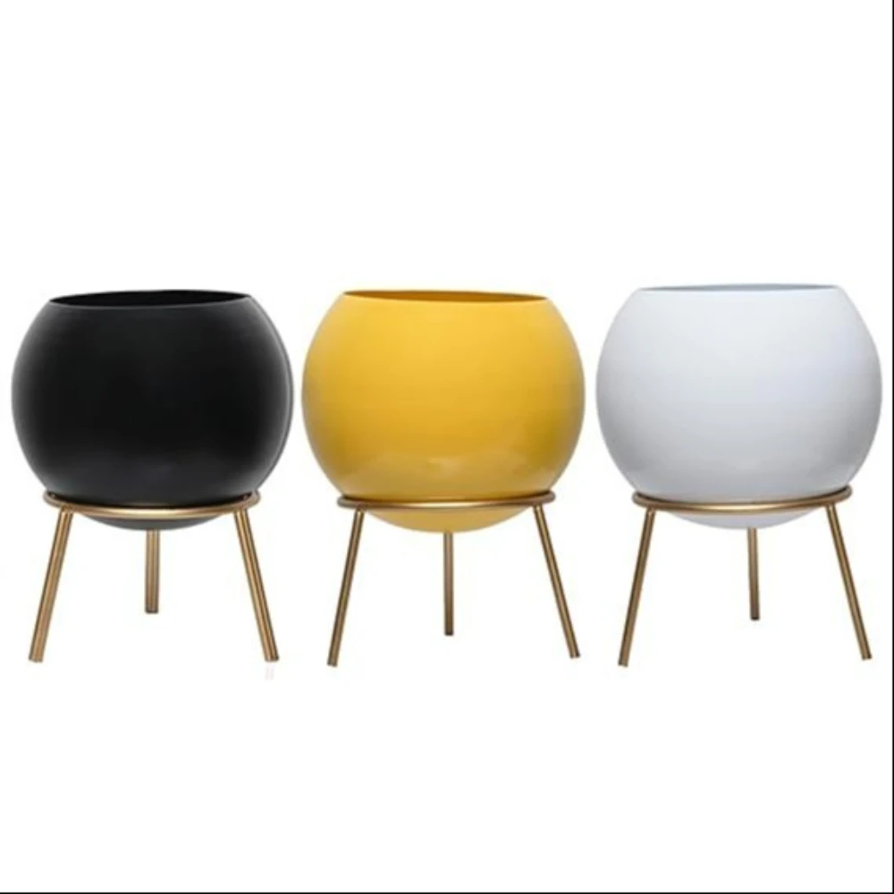 Add a touch of elegance to your home or office decor with this set of 3 modern iron planter pots. Each pot features a sleek round design and comes in stylish black, yellow, and white finishes, perfectly complemented by gold iron stands for a chic, contemporary look. Ideal for succulents, small indoor plants, or artificial flowers, these planters make a beautiful centerpiece for shelves, desks, or windowsills.