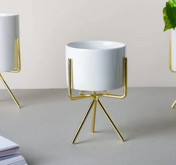 Add a touch of elegance and charm to your living space with this Modern White Iron Planter Set with Gold Stand. Designed with a sleek, contemporary look, these planters perfectly blend sophistication and simplicity. The soft pastel white pots paired with sturdy golden tripod stands make them ideal for both indoor and outdoor décor.