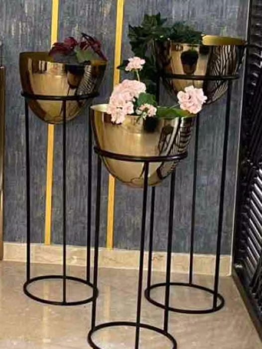 Crafted from high-quality Iron with a glossy gold finish, each pot rests securely on a sturdy black powder-coated iron stand, adding both height and style to your greenery. Ideal for showcasing indoor plants, succulents, or decorative foliage, these planters create a stunning vertical display that enhances any interior space.