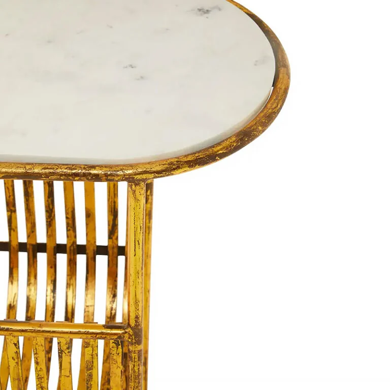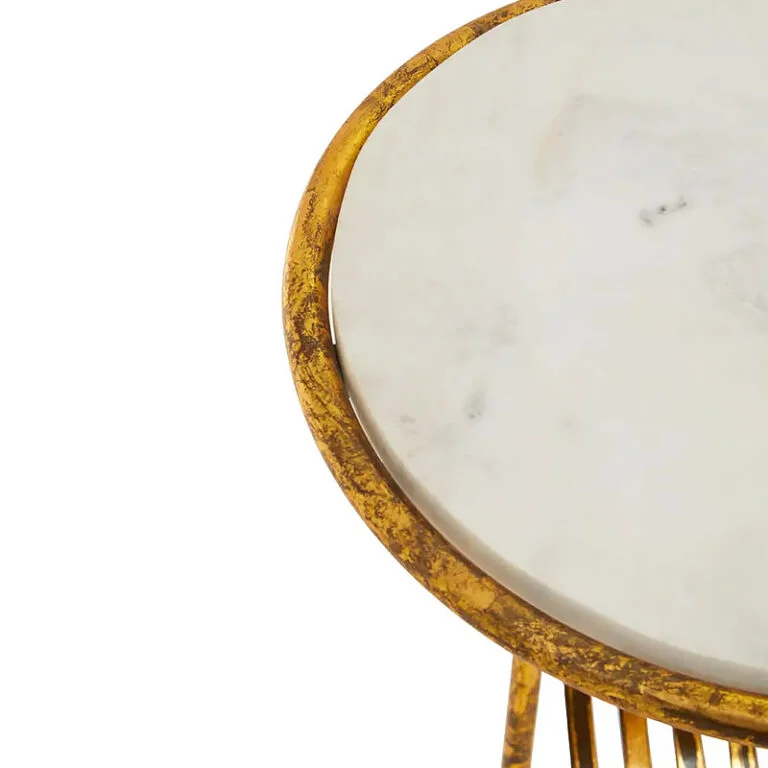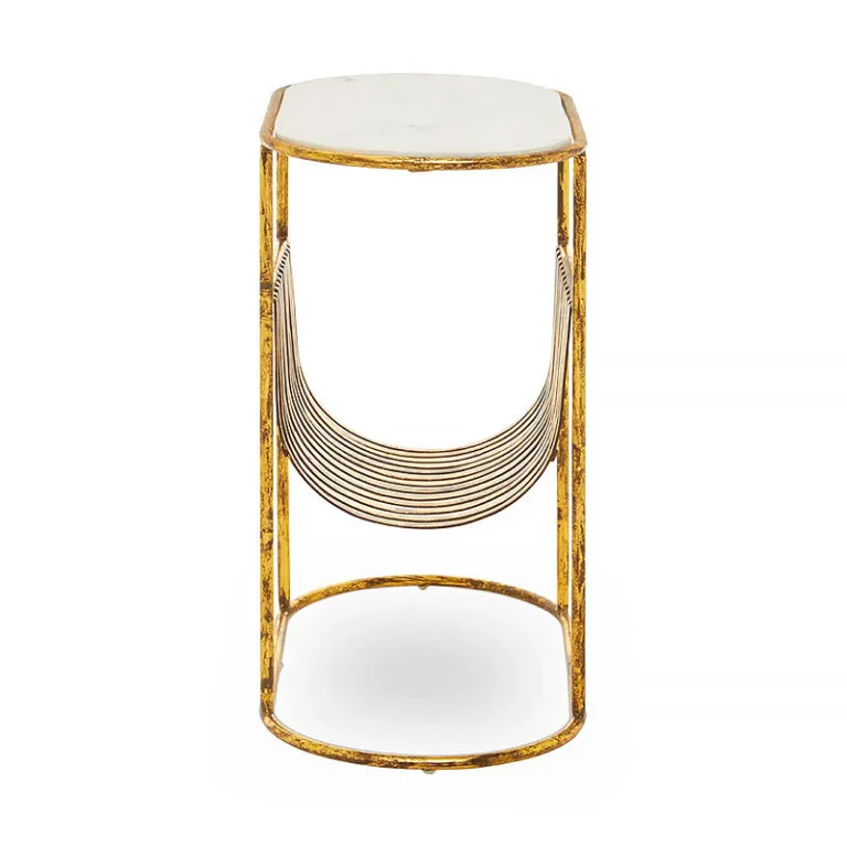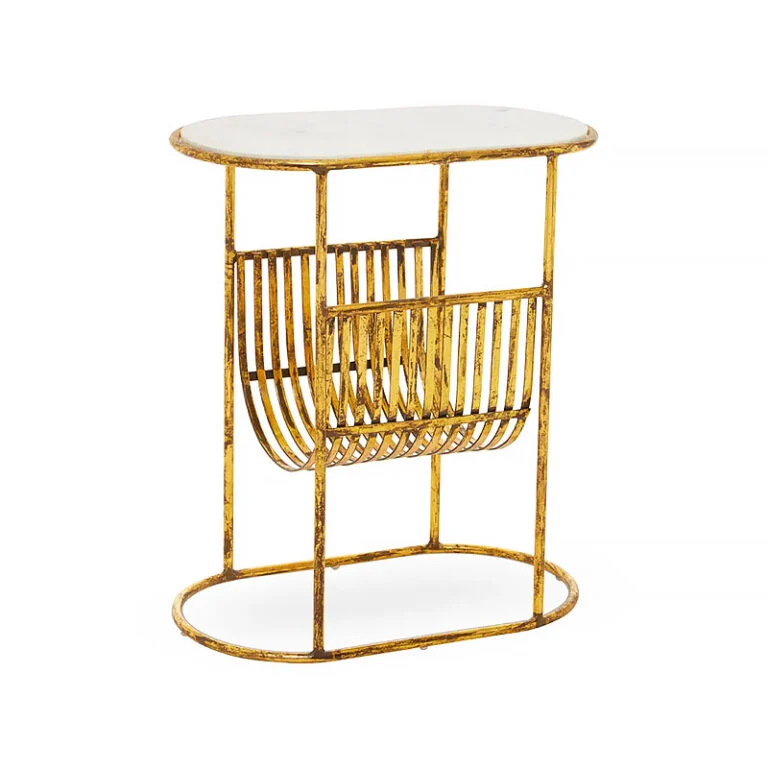 The unique base is crafted from distressed or antique-finish gold-tone metal with a slight patina, giving it a warm, vintage character. Below the top, the frame integrates a practical slatted metal basket—ideal for holding magazines, books, or even an extra throw blanket or decorative pillow (as shown). This piece perfectly blends the utility of a caddy with the function of a side table, making it an essential item for any cozy and stylish home.